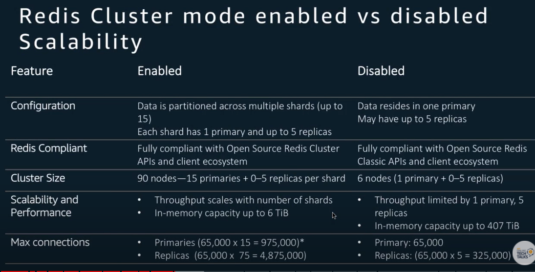 With Cluster Mode enabled, your Redis cluster can now scale horizontally (in or out) in addition to scaling vertically (up and down). In a Redis cluster with cluster mode disabled, you can have up to five read replicas in your replication group. Adding or removing replicas incurs no downtime to your application. In a Redis cluster with cluster mode enabled, clusters can have up to ninety shards by default (which can be increased if requested) and up to five read replicas in each node group.